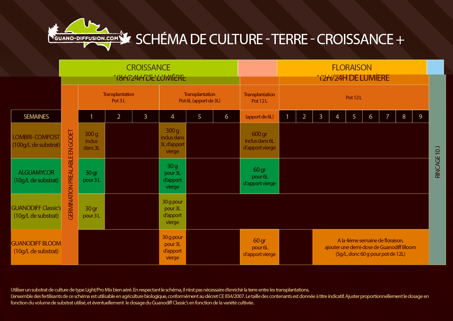 Nous vous recommandons fortement l’utilisation d’une demi-dose de GUANODIFF BLOOM par griffage tous les 15-20 jours après la mise en pot.